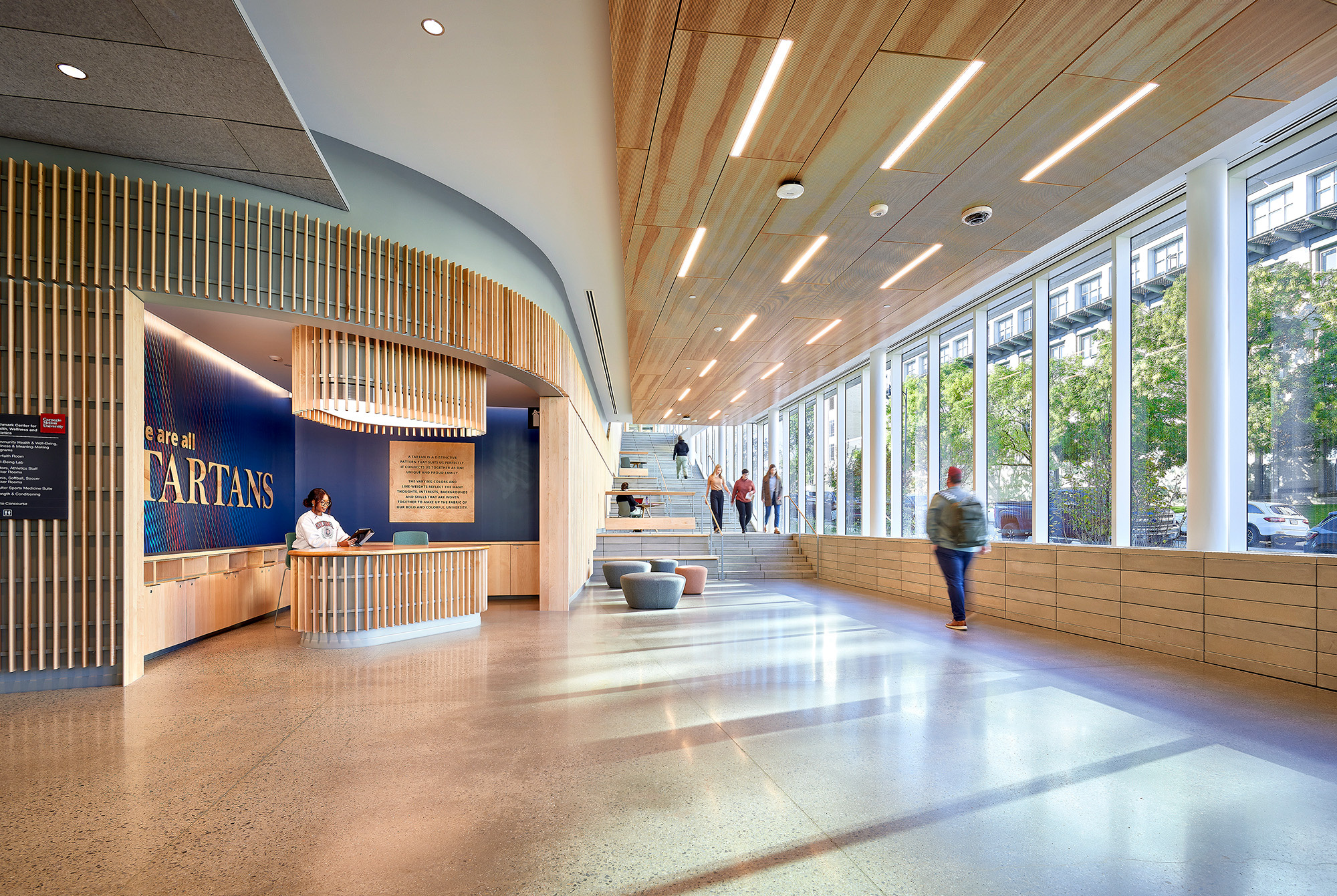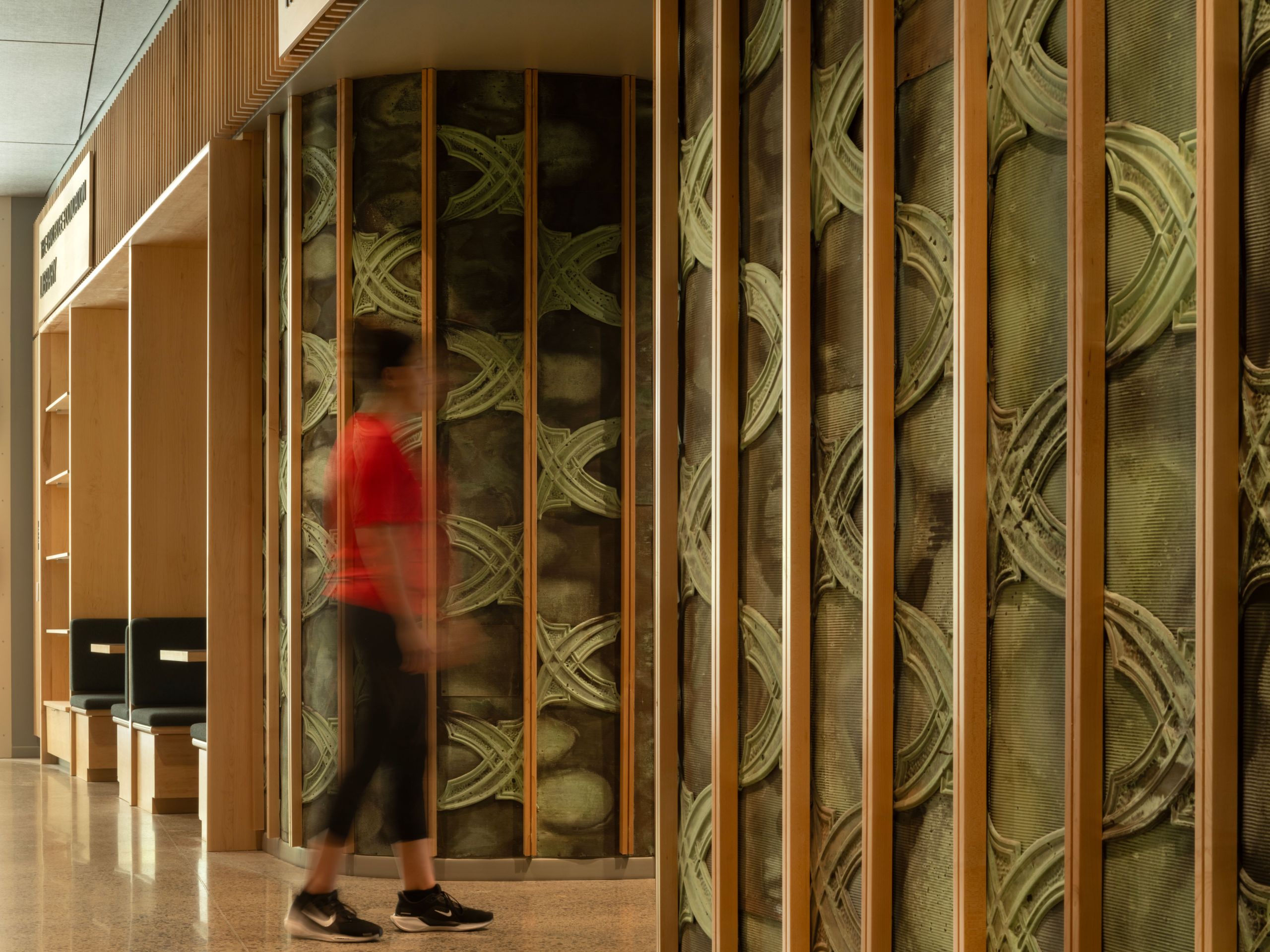 The Highmark Center is the hub of a campus network for student well-being that preserved and integrated 24,000 square feet of the historic Henry Hornbostel-designed Skibo Gymnasium for use as a new fieldhouse. The capstone of a 15-year planning process, the project balances the interconnectivity of diverse departments––from the University’s Health Services to Counseling and Psychological Services and Wellness Initiatives, to Religious and Spiritual Life Initiatives, and Athletics. The design team also reintegrated salvaged materials from the 100-year-old Skibo Gym, including 6,000 square feet of wood flooring and 70% of Hornbostel’s original stamped copper fascia panels. The multi-activity gym, which is nestled into the hill next to the Skibo Gym, features the original exterior wall, now an interior wall, and its exposed stone foundations as part of the new addition.