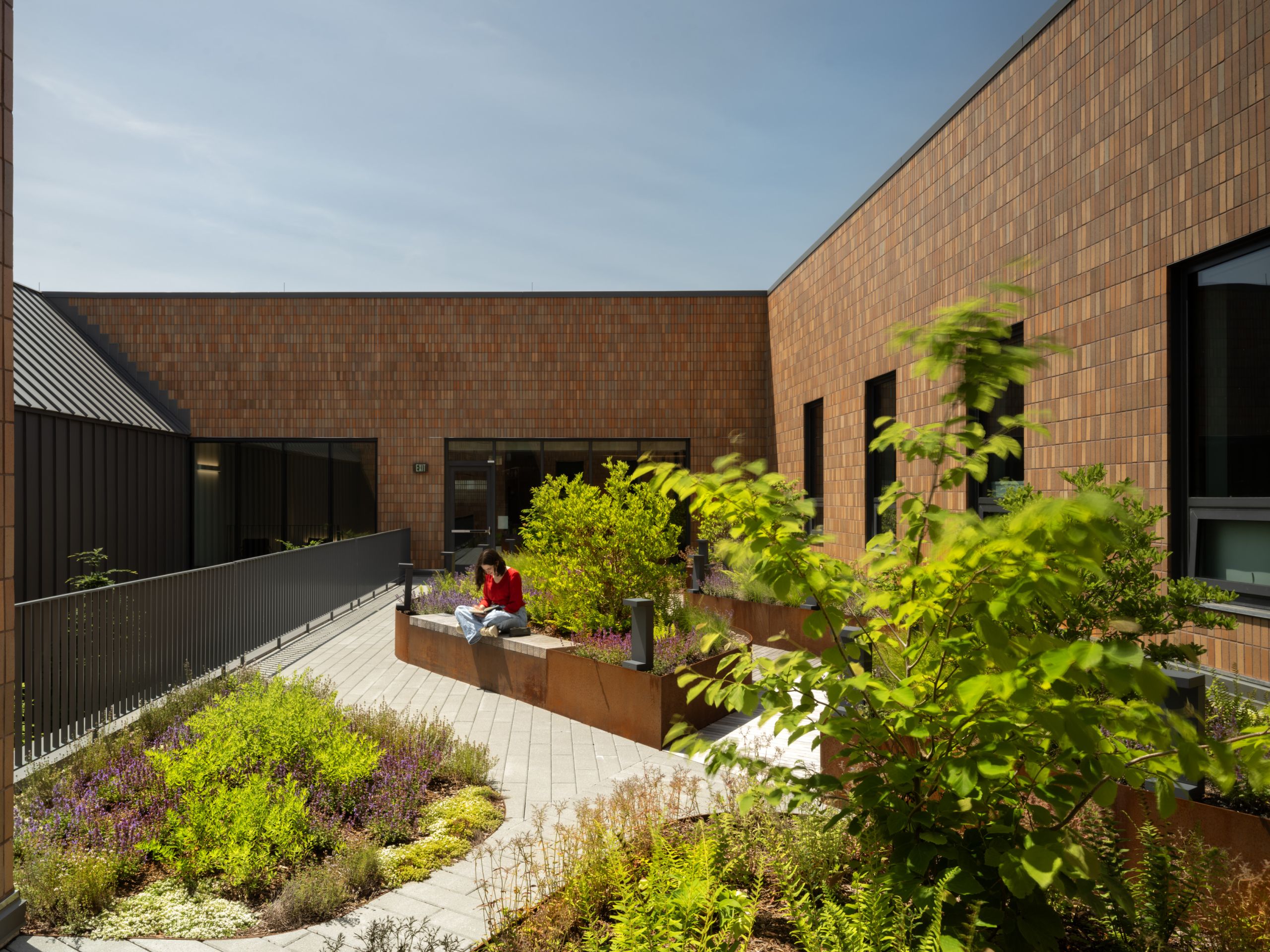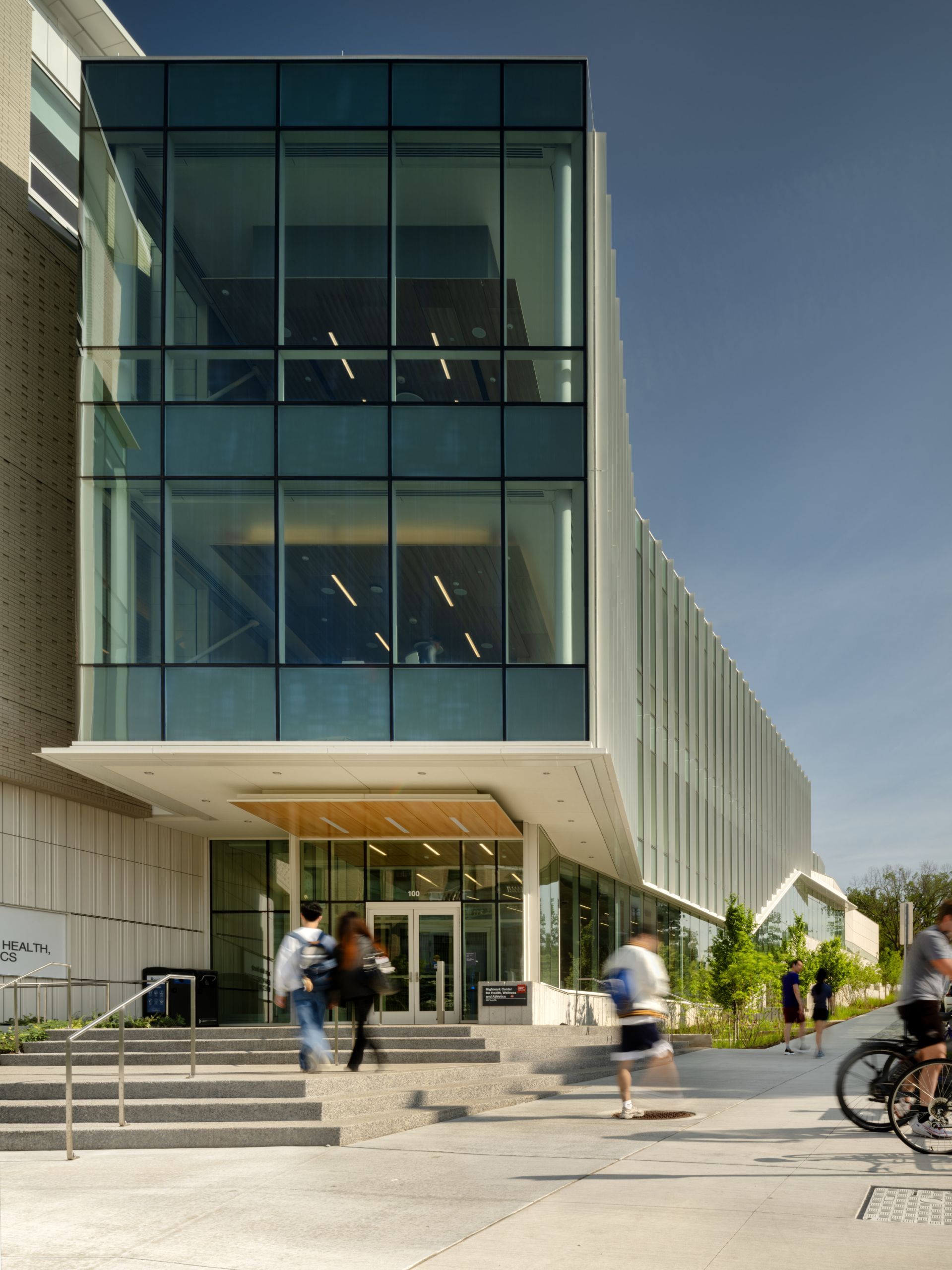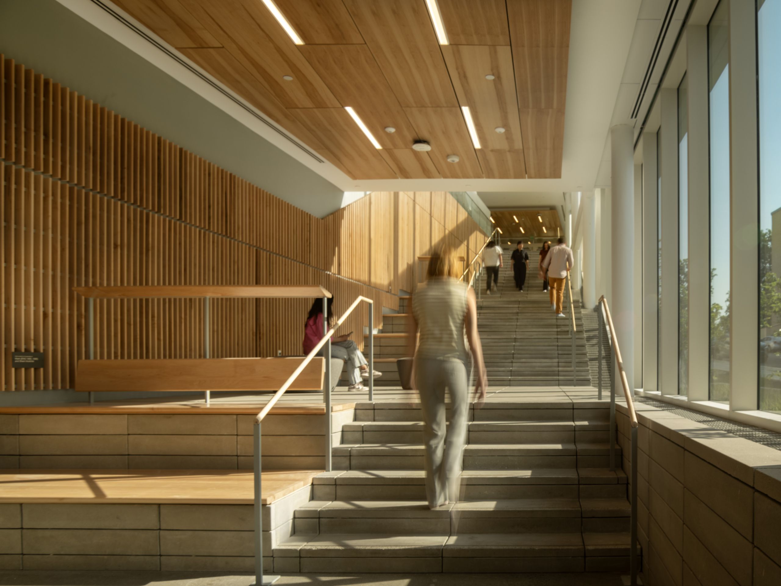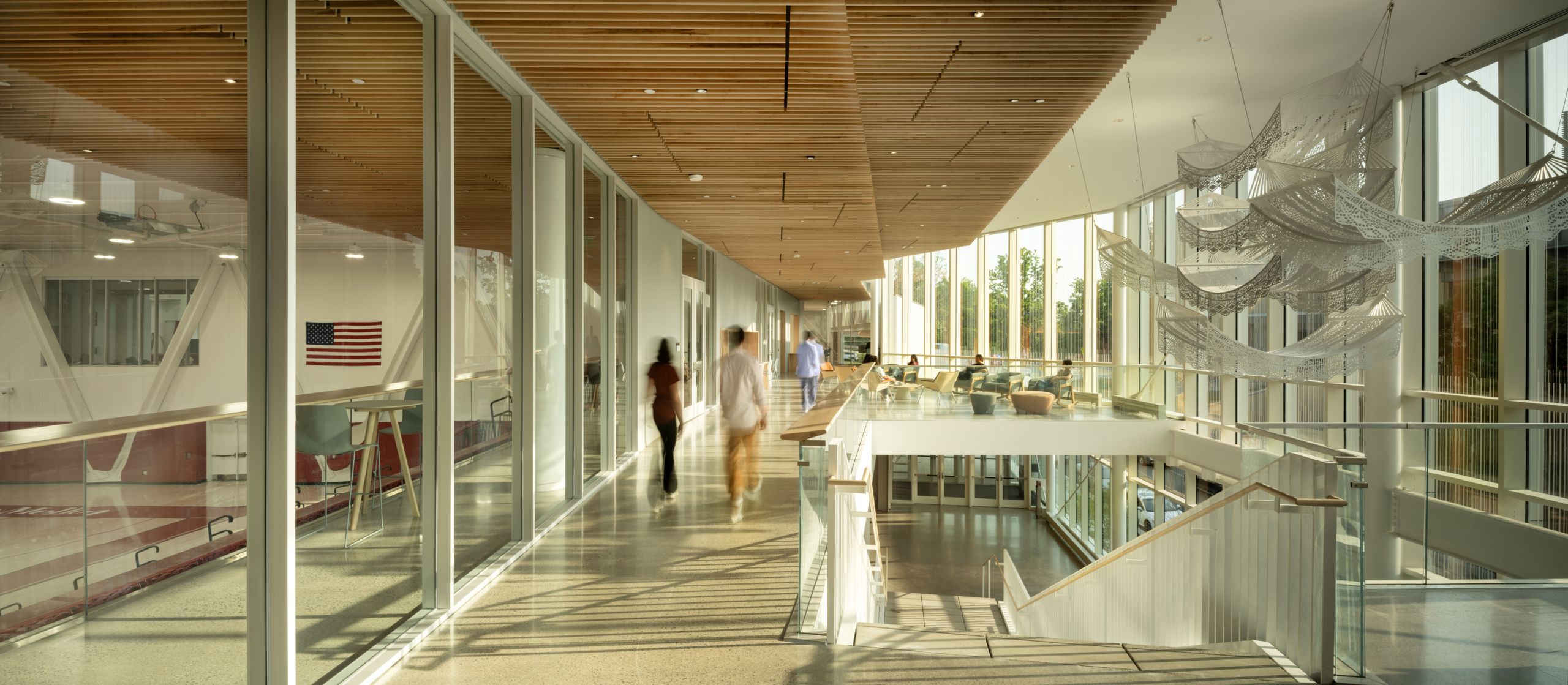 With mounting academic, social, and environmental pressures, universities around the country are seeking ways to provide holistic wellness services to support students as they navigate the challenges of academic life. The Highmark Center for Health, Wellness and Athletics co-locates CMU’s University Health Services (UHS), Counseling and Psychological Services (CAPS), Wellness Initiatives, Religious and Spiritual Life Initiatives, and Athletics, ensuring students have access to the support they need to thrive. Whether it is an athlete meeting with a therapist to help manage anxiety, a grad student who needs a quiet place for daily prayers, or an engineering undergrad playing pick-up basketball with friends, the Highmark Center for Health, Wellness and Athletics is a welcoming hub for student life and whole-self well-being. The LEED Gold design integrates wellness and nature throughout with strong connections to the outdoors and a focus on creating healthy indoor spaces with access to natural light, ventilation, and natural materials.