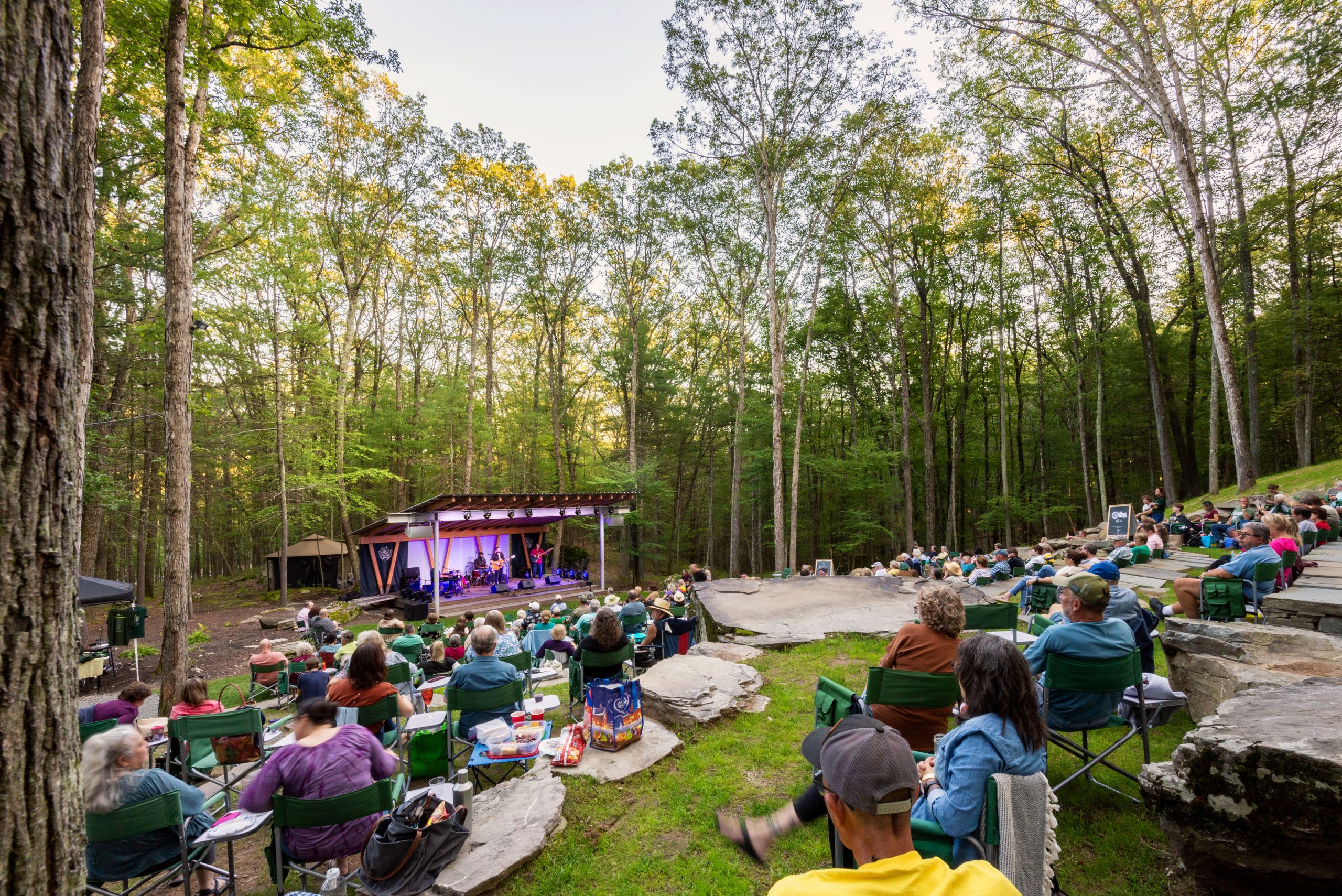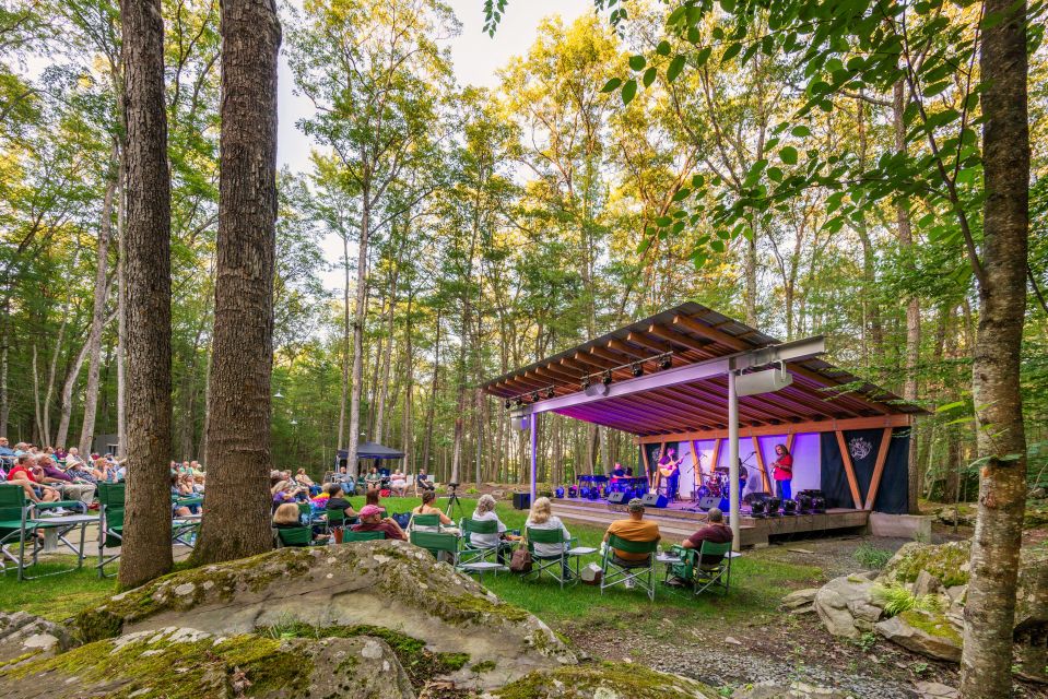 A stage and amphitheater nestled in the hillside of a forested clearing offer an immersive experience for both performers and audience.