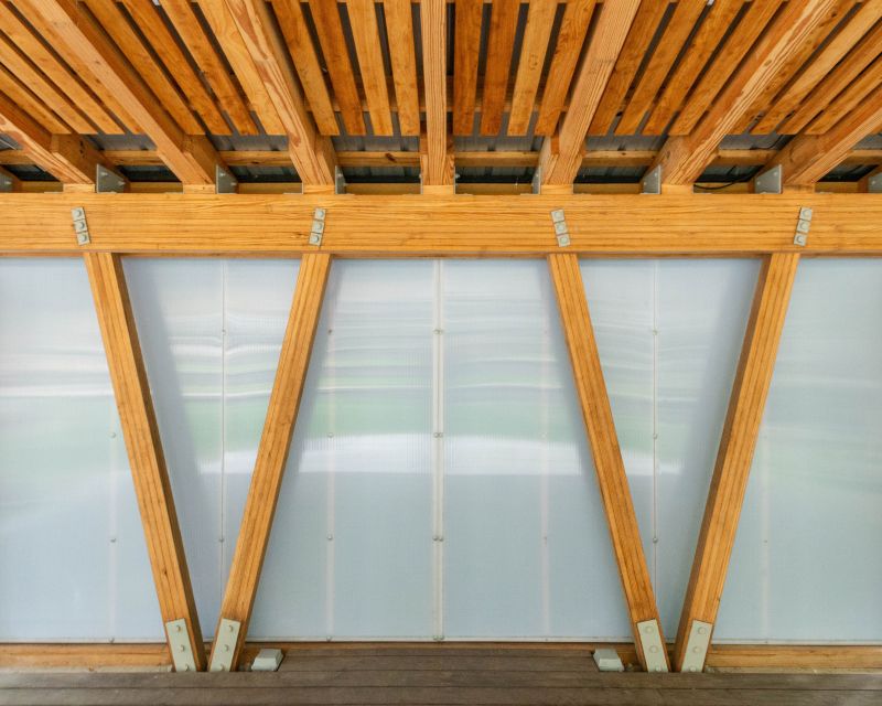 The structure’s design is simple. An angled roof shields rain and sun, projects the natural acoustics, and is engineered to accommodate a future green roof, as funding permits, to further blend into its surroundings. The stage is separated from a greenroom by large, sliding polycarbonate panels that act as a backdrop and provide privacy to the performers. Movable, wireless color-changing track lights—which can be controlled by a phone or tablet app—are used on the upstage sliding wall, creating flexibility without additional hardwired systems.