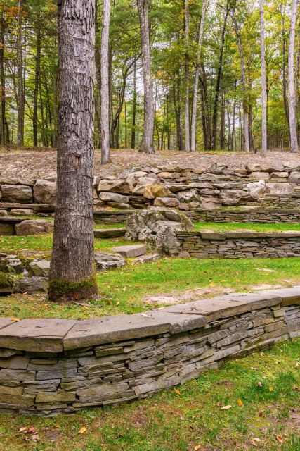 Amphitheater seating uses stone sourced from a nearby quarry. Each of the five tiers is connected by paths where possible, rather than steps, to increase accessibility. Mats are inserted under the lawn at the base of the stage to accommodate wheelchairs.