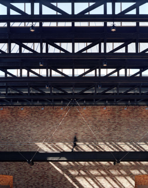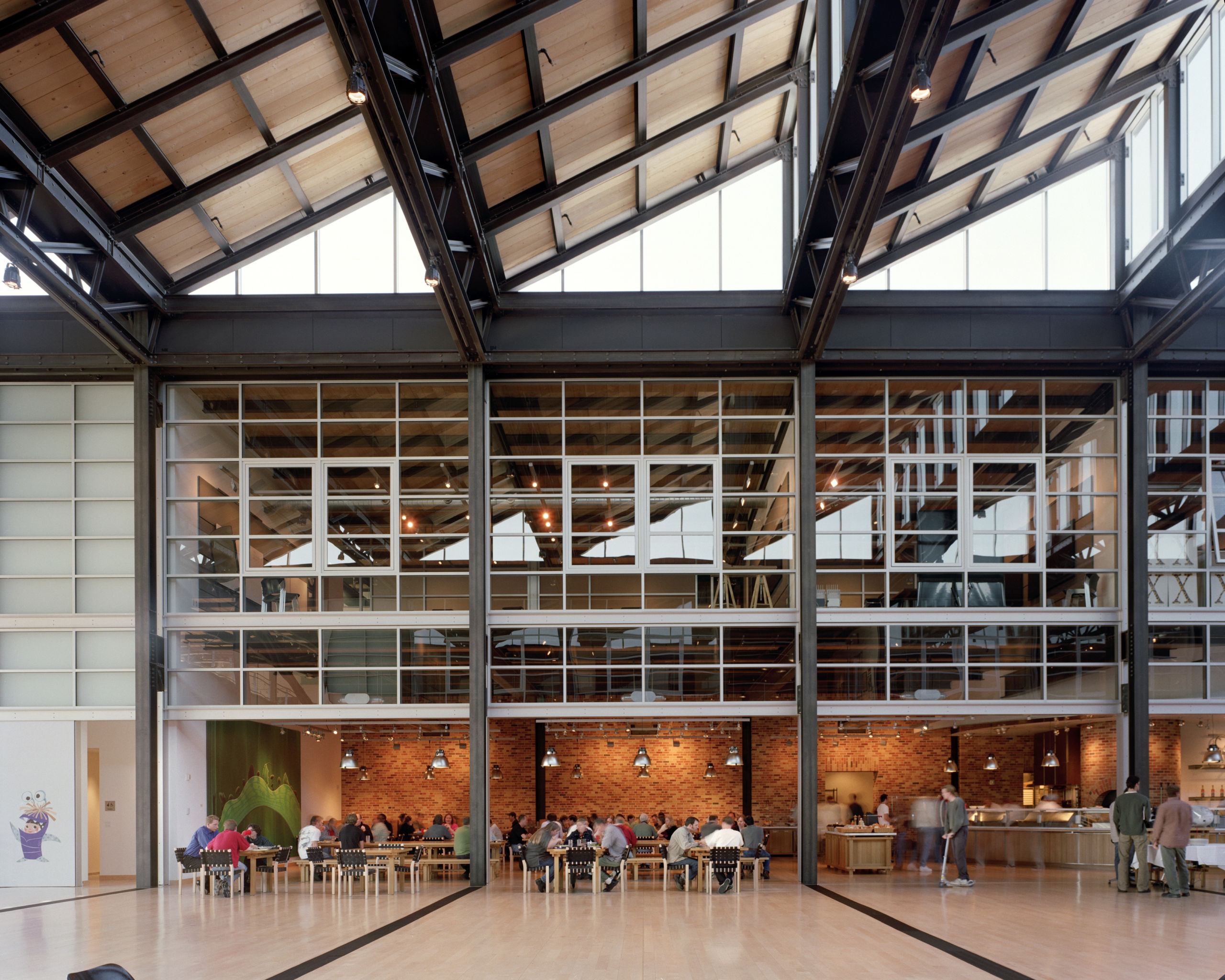 The facility is rigorously detailed and crafted with a palette of brick, sandblasted clear-coated structural steel, exposed wood decking, glass and stainless steel. Custom roof trusses support saw-toothed skylights that provide diffused natural light throughout the space. Two pedestrian bridges, cable-suspended from the roof, span the 60-foot wide atrium—a visible demonstration of the beauty of structural engineering. These materials are used throughout the site and campus to maintain Pixar’s language, quality and culture.