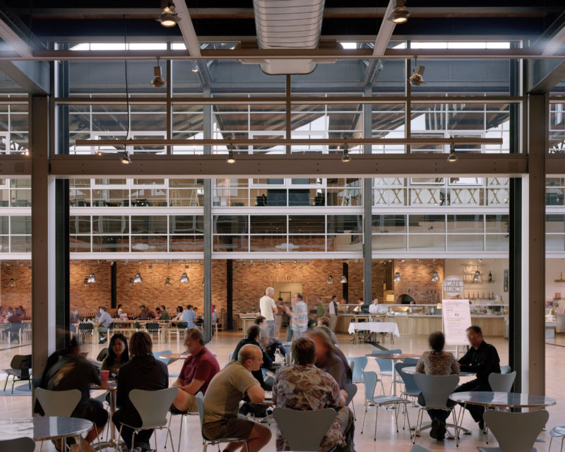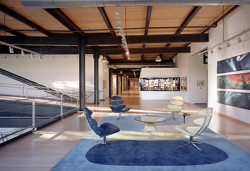 Pixar’s Emeryville studios, located on a 15-acre site in the city’s warehouse district, embodies the company’s culture of ideas exchange and collaboration among its many story artists, animators, and computer scientists. The project’s industrial aesthetic responds to both its physical context and the technical creativity of the company. Designed for a staff of 600, the two-story steel-and-masonry building has an expansive atrium at its core that acts as a central piazza for the campus. Activated by the lobby, conference rooms, lounges, and cafe, this dynamic town center links offices, pathways, and a 250-seat theater.