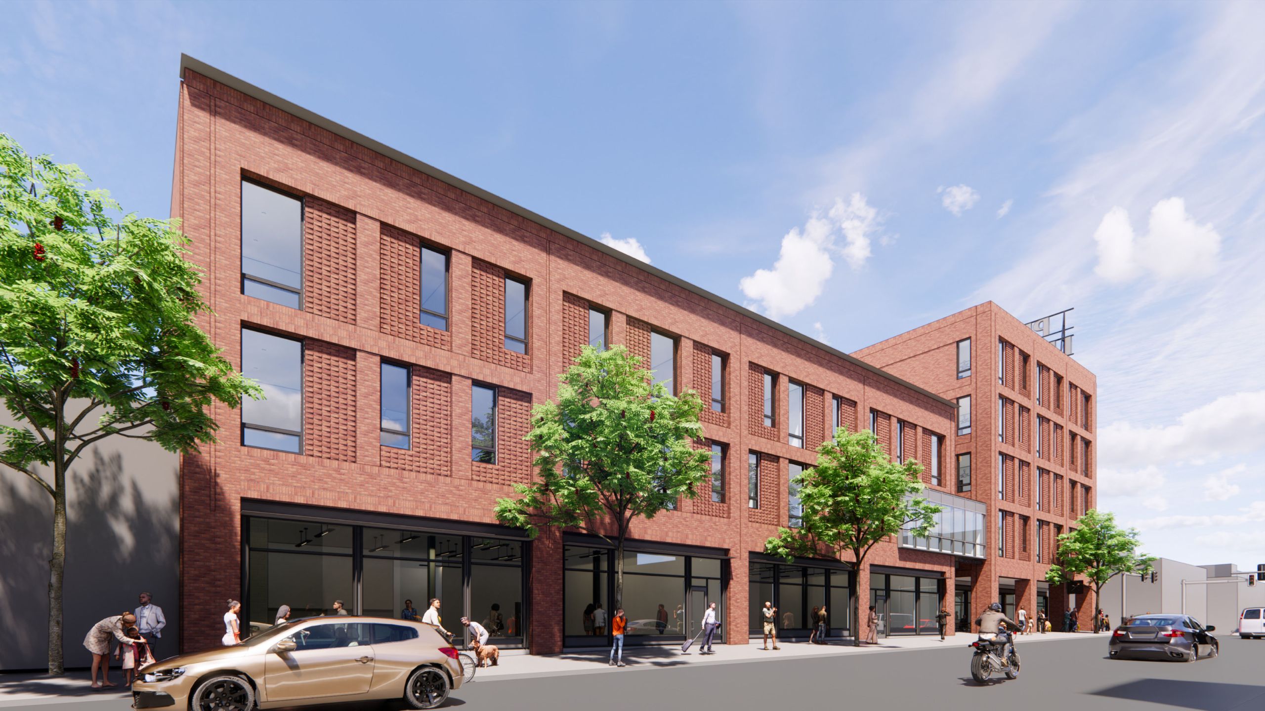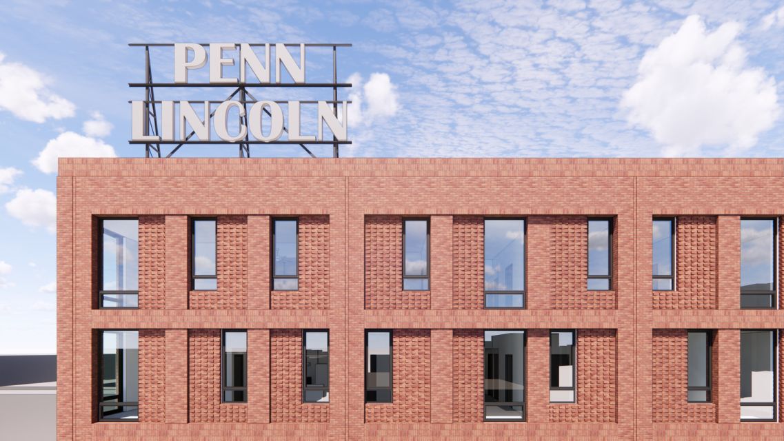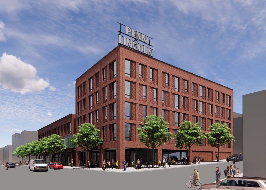 As part of ACTION-Housing’s mission, the residences will offer families and individuals earning at or below 60% of the Area Median Income dignified and secure housing. Each unit features large windows, providing ample daylight and views of downtown Wilkinsburg. Interior bridges on the second and third floors span the multi-story, daylight-filled entry lobby, connecting the east and west sides of the residential building while providing expansive views of the surrounding neighborhood context. Below the second floor, ground-level retail- and restaurant-ready spaces are lined with floor-to-ceiling windows. Secure bicycle storage for tenants will be accessible through the residential lobby. As a nod to the historic Penn-Lincoln Hotel, the building will also feature a large Penn Lincoln sign on the roof and will use materials salvaged from the former hotel throughout the interiors.